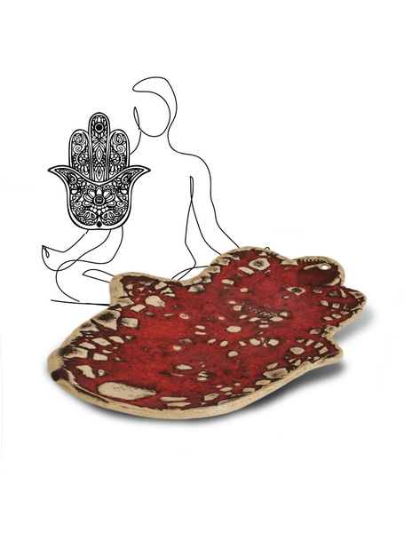 Czerwona podstawka pod kadzidła Ręka Fatimy mozaika została wykonana w Polsce przez autorską pracownię ceramiki, dłoń została uformowana ręcznie z gliny i poszkliwiona. Wyprodukowana została według naszego wspólnego projektu, wyłącznie dla ProAge.