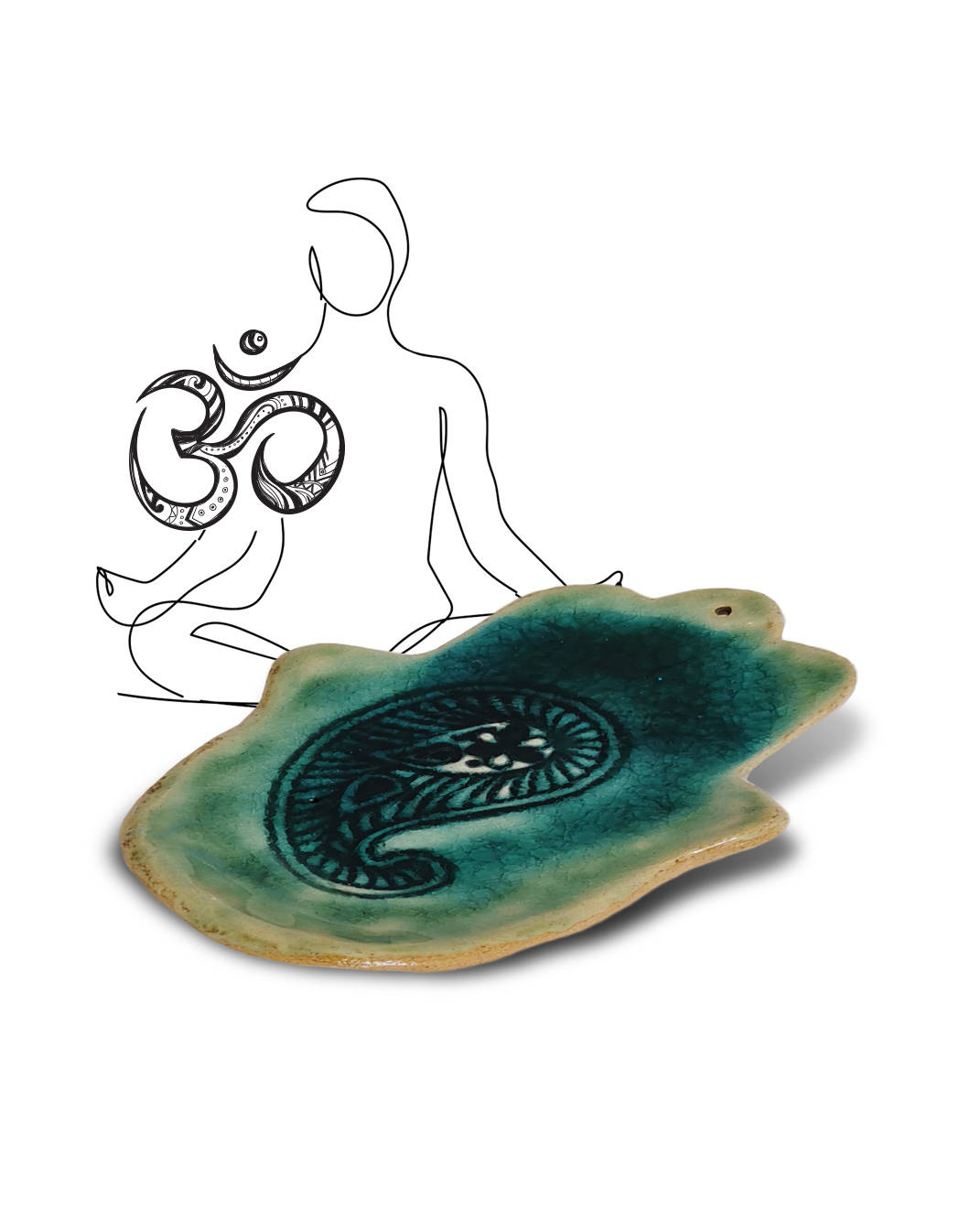 Ceramiczna, turkusowo-zielona podstawka pod kadzidła Ręka Fatimy orientalna została ręcznie zrobiona i nadaje się pod różnego rodzaju kadzidła - Palo Santo, Białą Szałwię, kadzidła patyczkowe i stożkowe.
