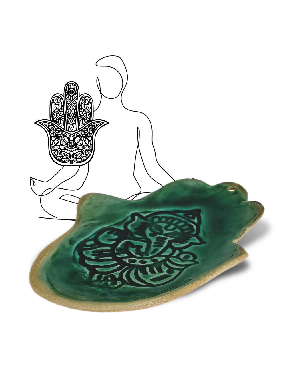 Ceramiczna, zielona podstawka pod kadzidła Ręka Fatimy Ganesha jest ręcznie robiona i nadaje się pod różnego rodzaju kadzidła - Palo Santo, Białą Szałwię, kadzidła patyczkowe i stożkowe.